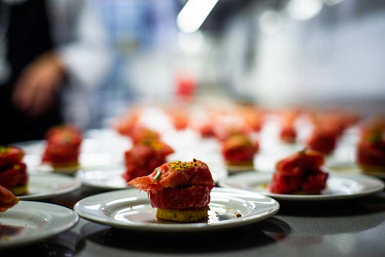 La serata è iniziata con Manzo crudo e marinato con pistacchi e burrata, abbinato a Laurent-Perrier Brut La Cuvée (Chardonnay). A seguire una Ricciola in tartare con carpaccio di pomodori, basilico e polvere di olive, servita con un Laurent-Perrier Cuvée Rosé (Pinot Noir). Laurent-Perrier Blanc de Blancs nel bicchiere con in tavola i Ravioli di patate al limone con gamberi rossi di Mazara e bottarga di branzino. Infine Seppia arrostita in varie consistenze abbinata al Millésimé 2008 dell'azienda (50% Chardonnay, 50% Pinot Noir) - i millesimati Laurent-Perrier vengono prodotti solo nelle annate migliori. A chiudere, in dolcezza, una Sfoglia di meringa e limone con il suo sorbetto. In complesso un riuscito matrimonio fra piatti e bicchieri proposti, grazie anche alle diverse sfumature di questi champagne.