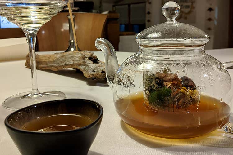 Merita una menzione a parte l'Essenza di terra. Alessandro esce dalla cucina, si avvicina al tavolo e spiega: «È una ricetta dell'Impero austro-ungarico». Una teiera, al cui interno un brodo preparato utilizzando bucce di topinambur, patata rosa tostata e un consommé da 10 diversi tipi di carne (dalla perice alla lepre, dal camoscio al cervo), poi licheni, camomilla e quell'aggiunta di menta a completare il tutto. Un gusto avvolgente ed intenso. Gilmozzi lascia l'intera teiera, «così potete berne ancora mentre assaggiate il Raviolo».