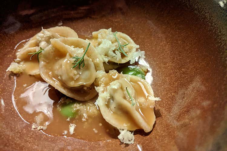 I Ravioli di guancia di capriolo e broccolo di Santa Massenza sanno di casa, rievocano uno spazio semplice, intimo, accogliente. Nonostante l'impressione, la preparazione non è così scontata: il broccolo infatti è declinato in tre diverse consistenze: grattuggiato, in crema bianca, in crema verde (con aggiunta di clorofilla).