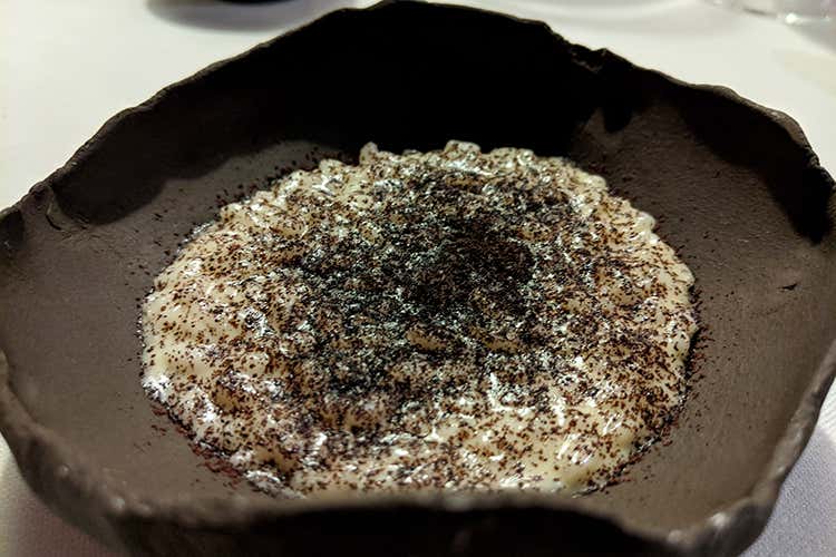 Seguiamo la preparazione in cucina di un Riso Carnaroli Acquerello invecchiato 7 anni nel suo germoglio, mantecato con Parmigiano, completato dall'aggiunta di polvere di cima di pigne fermentate. Ci incuriosisce... Vogliamo saperne di più: «Il profumo di questo riso me lo porto dietro fin da piccolo... Andavo nelle baite, noi qui in Alpe Adria le chiamavamo "Foghere", perché s'accendeva il fuoco e si mettevano sopra i wurstel». La zona è stata sotto l'impero austro-ungarico per anni, una tradizione quindi che non deve stupire. «Tornavo sempre a casa con un profumo intenso addosso, attaccato alla giacca... Per me era un profumo, ma anche un sapore».