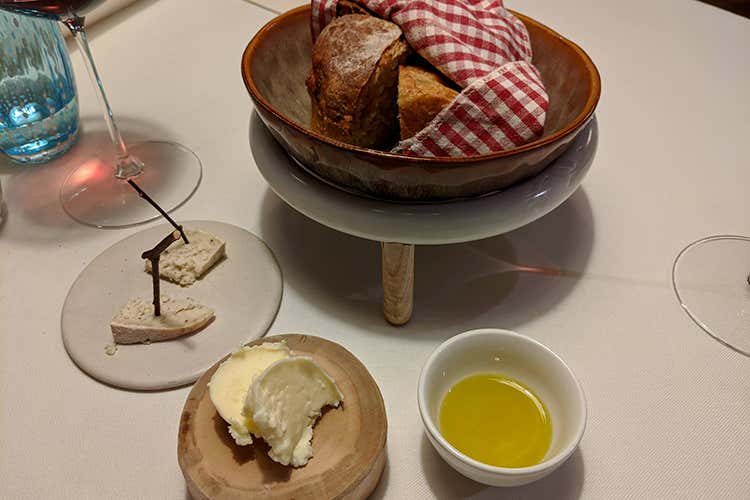 Sul pane c'è molto da discutere oggi, specialmente nei ristoranti di un certo livello. Il cesto del pane, quello a cui tutti noi italiani siamo per tradizione così abituati, cede il posto a una riflessione attenta circa il rapporto tra sazietà dell'ospite e apporto nutrizionale delle varie portate. «Quando crei un percorso devi prestare attenzione ai carboidrati... Troppi piatti a base carboidrato rischiano di essere esagerate per il commensale, che uscirebbe appesantito dopo 10/15 portate, quando invece dovrebbe alzarsi da tavola solo sazio». Il cesto del pane all'inizio della cena, «che lo finisci subito perché è dannatamente buono e poi non mangi più nulla», cede il passo quindi al pane come portata. «Ti faccio anche capire così l'importanza del pane, l'importanza della condivisione» e allo stesso tempo questa scelta permette ad Alessandro di esaltare materie prime da accostarci, come il burro home-made montato al momento, l'olio «fatto da amici miei importanti» dalla Sicilia - quindi con un prodotto più delicato rispetto a quanto si possa trovare in un olio pugliese -, il formaggio «fatto da Amor, un contadino stupendo che ci porta cose incredibili».
