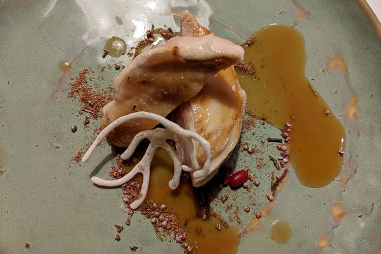 La Pernice...Una pernice cotta su corteccia con nappatura di fiori di erica con ginepro e punta di crespino viene impiattata direttamente al tavolo, non da Gilmozzi, ma da "uno dei suoi", parte della brigata. «Faccio uscire i miei cuochi in sala. Un piatto a testa, escono e lo raccontano. La prima volta c'è tanta emozione perché non sono abituati, ma a forza di farlo si crea una capacità di comunicare col cliente pazzesca!».