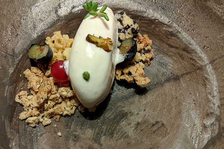 Dal salato al dolce Alessandro Gilmozzi ci arriva gradualmente. Il primo "dessert" è la Zucca come un caco, uva di Marzemino ed erba gatta. La zucca è maturata a ultrasuoni; il gelato è fatto con l'uva e i suoi acini (che rimangono croccanti); la crema è preparata partendo da panna e latte acido... La cosa più stupefacente è che la zucca sa veramente di caco! Segue il particolarissimo Icy Corteccia, bel sunto della filosofia di Gilmozzi: un gelato alla corteccia con crumble di sottobosco, licheni, nocciole, radice di liquirizia selvatica, borraccina e fiori di menta. A chiudere l'immancabile piccola pasticceria: una Pigna di pino mugo macerata nel miele, un Tiramisù salato con cenere di pigna, mascarpone e skir di mandarino e una Pastiglia all'abete.