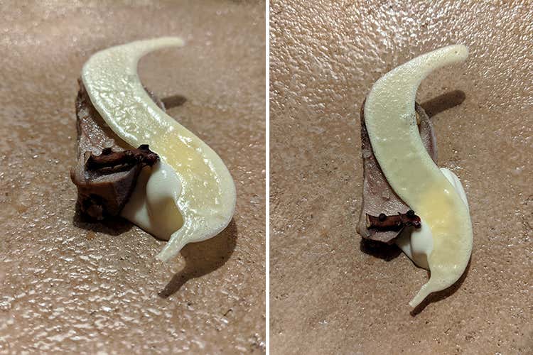 Si comincia dalla radice di liquirizia quando si assaggia la Lingua di cervo mineralizzata, cotta ad ultrasuoni e ben abbinata al gelato alla senape di Fiemme. Il piatto è modello lampante del viaggio in cucina di Gilmozzi: prodotto del territorio portato alla massima espressione grazie alle migliori tecnologie.