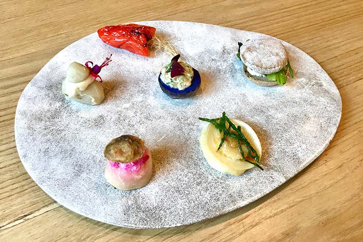 Un esempio è il piatto “Dedicato A. Parmentier”, un mix di patate con le loro terre. L’esperienza inizia sfregandosi le mani con un rametto di rosmarino: le mani diventano così “strumento” per procedere alla degustazione. Ad ogni assaggio, portando il boccone alla bocca, si potrà sentire al naso il profumo di rosmarino. Nel piatto si trovano, in senso orario, la patata Miss Blush con terra di topinambur, la patata Amandine con terra di fiore di cardo, la Patata Prunelle violacea con la sua stessa terra, la “patata americana” (proposta senza la sua terra perché in realtà è un tubero). Al centro del piatto la Parmentier, una scodella che contiene una crema di patate di montagna e porro, da bere bollente, scaldandosi le mani. Un gioco che valorizza un ingrediente povero, simbolico ma pieno di gusto come la patata e mette l’ospite al centro dell’esperienza gastronomica”.