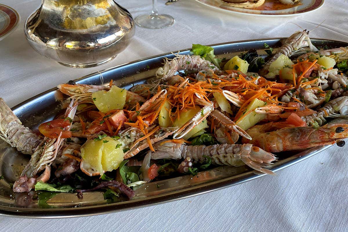 Vassoi su vassoi che sono proposti a ritmo incalzante appena seduti al tavolo (non chiedete il menu, ci pensano Roberto e il figlio Marco a soddisfare il palato con le proposte del giorno, sempre ricche di ghiotte sorprese). La carrellata di antipasti è quanto di meglio offrono il mare e la laguna. Ier l'altro, oltre alle tradizionali capesante alla brace, alle mazzancolle alla griglia, alle cozze gratinate al forno, agli scampetti, alle canoce, ai moscardini, all'impepata di cozze, al sautè di vongole veraci di Scardovari, alle sarde in saor, ho avuto la fortuna di assaggiare i "gransi" rosa (granchietti) al forno, una rarità che da sola valeva il viaggio. Da standing ovation anche il bollito "misto mare" al vapore (mazzancolle, polpo, cannolicchi, scampi), un vassoio imponente che occupa mezzo tavolo e che funge da apripista alla spettacolare "catalana", un must della Cappa d'Oro: astice, granciporro, canocchie, scampi, piovra, mazzancolle, il tutto abbinato a verdure e frutta di stagione.