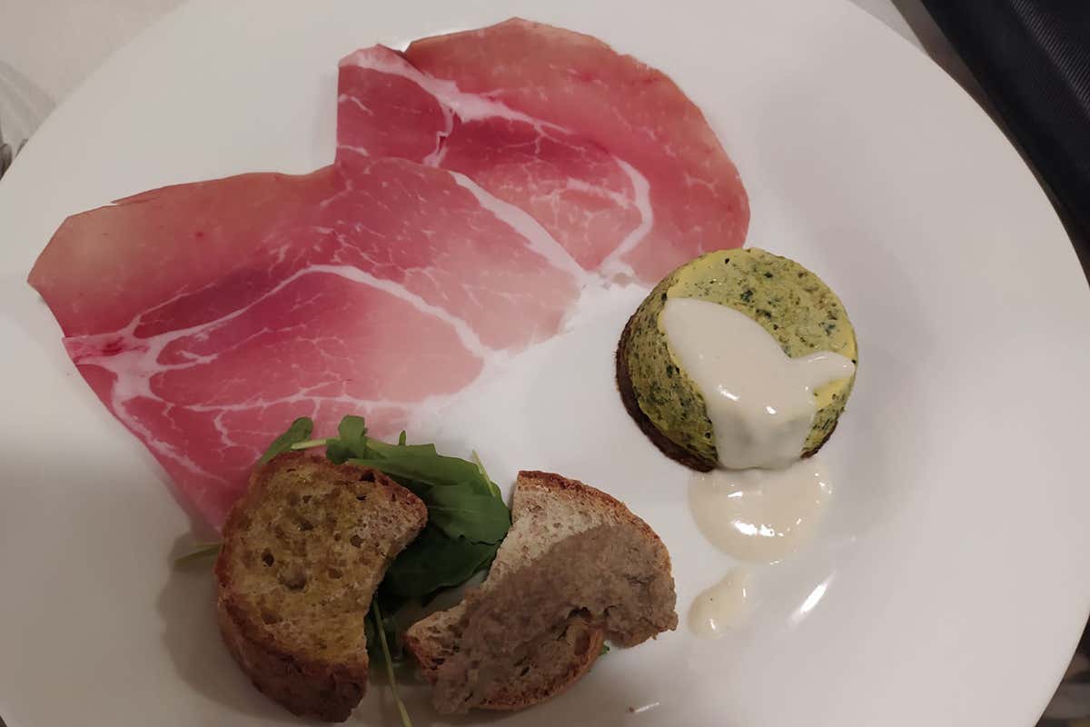 Una carrellata di antipasti eccellenti ha composto i buffet che hanno preceduto ogni menu: prosciutto di Norcia tagliato al coltello, crostini umbri con paté, carciofi, verdure ripassate, brustengo, petto di cappone tartufato in salsa di amarene, pecorini di diversa stagionatura, per citarne alcuni.