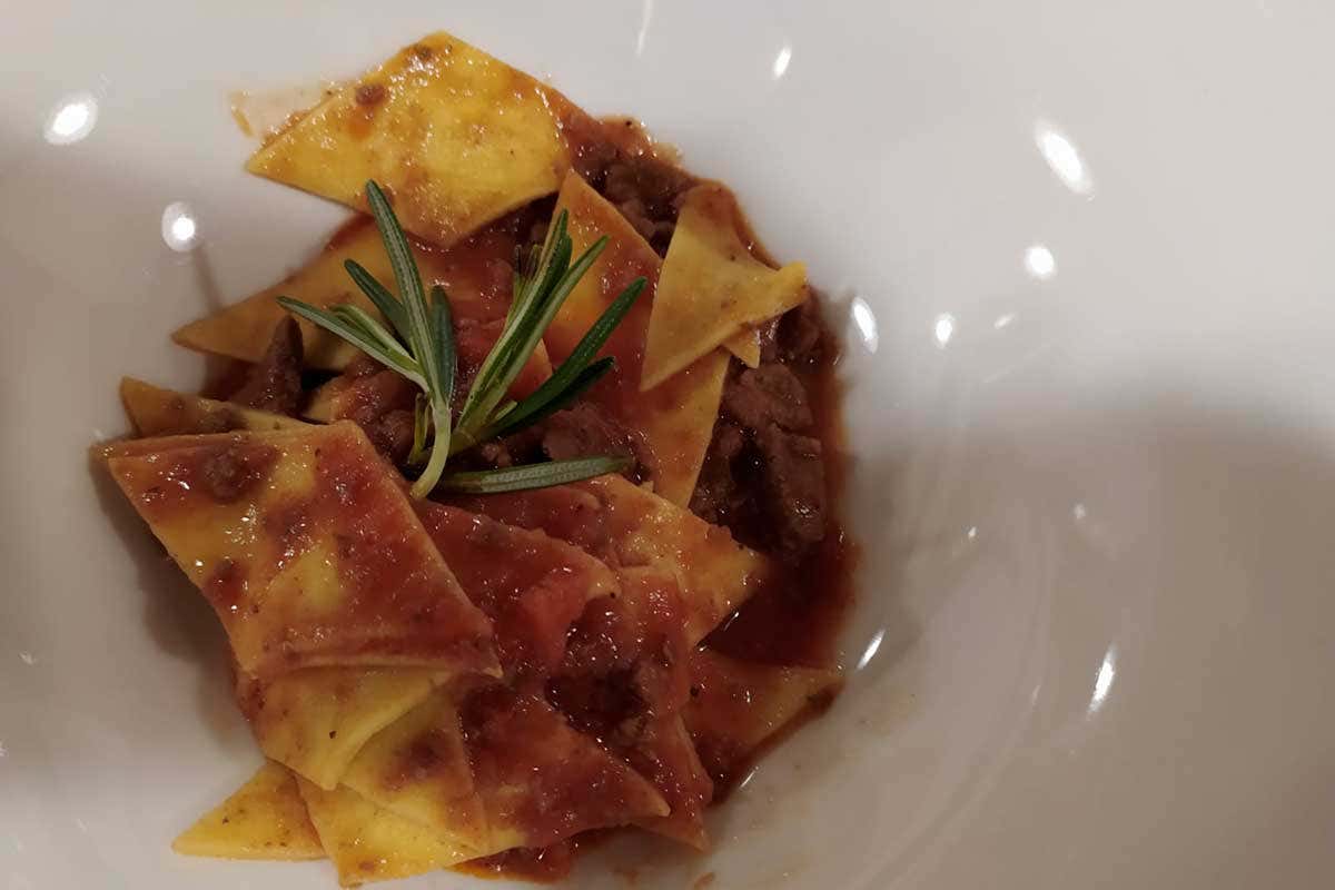 Per il suo “debutto” nell’associazione il cordiale direttore del ristorante La Rosetta, Gianfranco Quattrociocchi, ha proposto: Maltagliati fogliati a mano con sugo di cinghiale, Guanciola di manzetta Chianina con purè di patate e castagne e torta al testo, infine il dolce Scomposta di Mimosa. Il ristorante dell’hotel Villa Montegranelli ha servito: Carpaccio d’oca affumicato con agrumi e julienne di finocchi, Strangozzi alla curcuma e pepe con funghi di montagna e zucchine, Suprema di faraona al profumo di ginepro e patate arrosto, cremoso al Vin Santo con sbriciolata di tozzetti.
