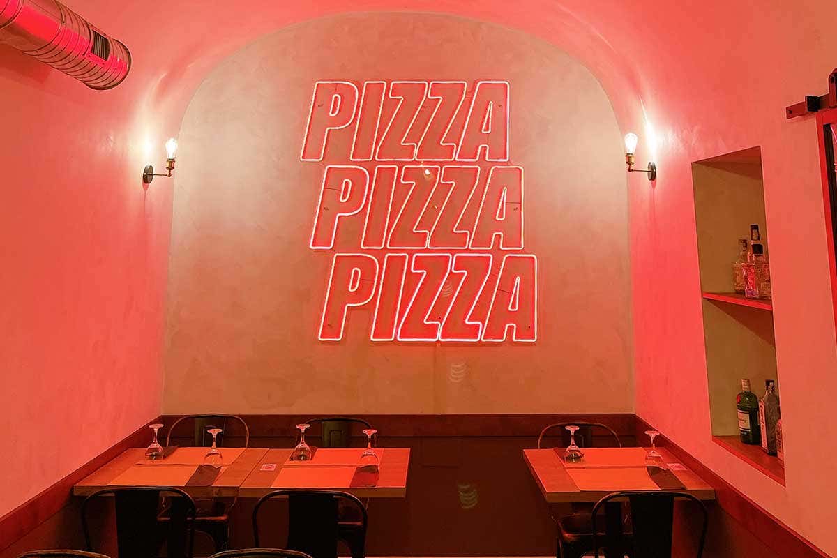 Il locale è volutamente essenziale, con sedie recuperate e tavoli ampi in cui alla bellezza è stata preferita la praticità. Solo un'ammiccante scritta luminosa in fondo alla parete, "pizza, pizza, pizza", attrae lo sguardo e invita al rito gioioso e conviviale. Un rito che può cominciare con un cocktail perché qui è proposto questo abbinamento e tra classici, signature e rivisitazioni la scelta è davvero vasta e la competenza del bartender Bryan è verificata. Sul bancone bar c'è poco di industriale, sciroppi ed estratti sono fatti in casa e le spezie come la cannella e i pepi neri fatti sono farri arrivare dall'India. Neppure gli appassionati della birra sono delusi, chi preferisce il vino a cui è dedicata una carta modesta ma ben composta con le etichette di San Michele Appiano.