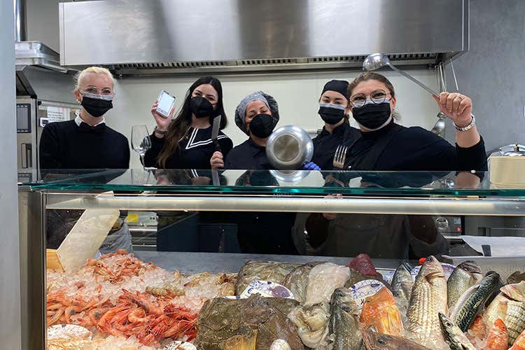 È un viaggio di scoperta, quello che si compie arrivando qui e trovando una bottega di sole donne, tutte in divise nere (comprese le mascherine che fanno risaltare gli occhi, come fossero delle sacerdotesse), mentre operano in armonia a tutto campo e offrono pesce, crostacei, molluschi a un prezzo onesto. Al banco di delicatessen si accompagna un plus assoluto che è quello di scegliersi il pesce che si vuole mangiare dopo che è stato trattato e accarezzato, più che cucinato, dalle sapienti mani di Mary la chef patron, autodidatta ma con alle spalle una grande scuola pratica in pescheria, che l’ha resa capace di capire cosa proporre e come trattare le diversità del mondo marino.