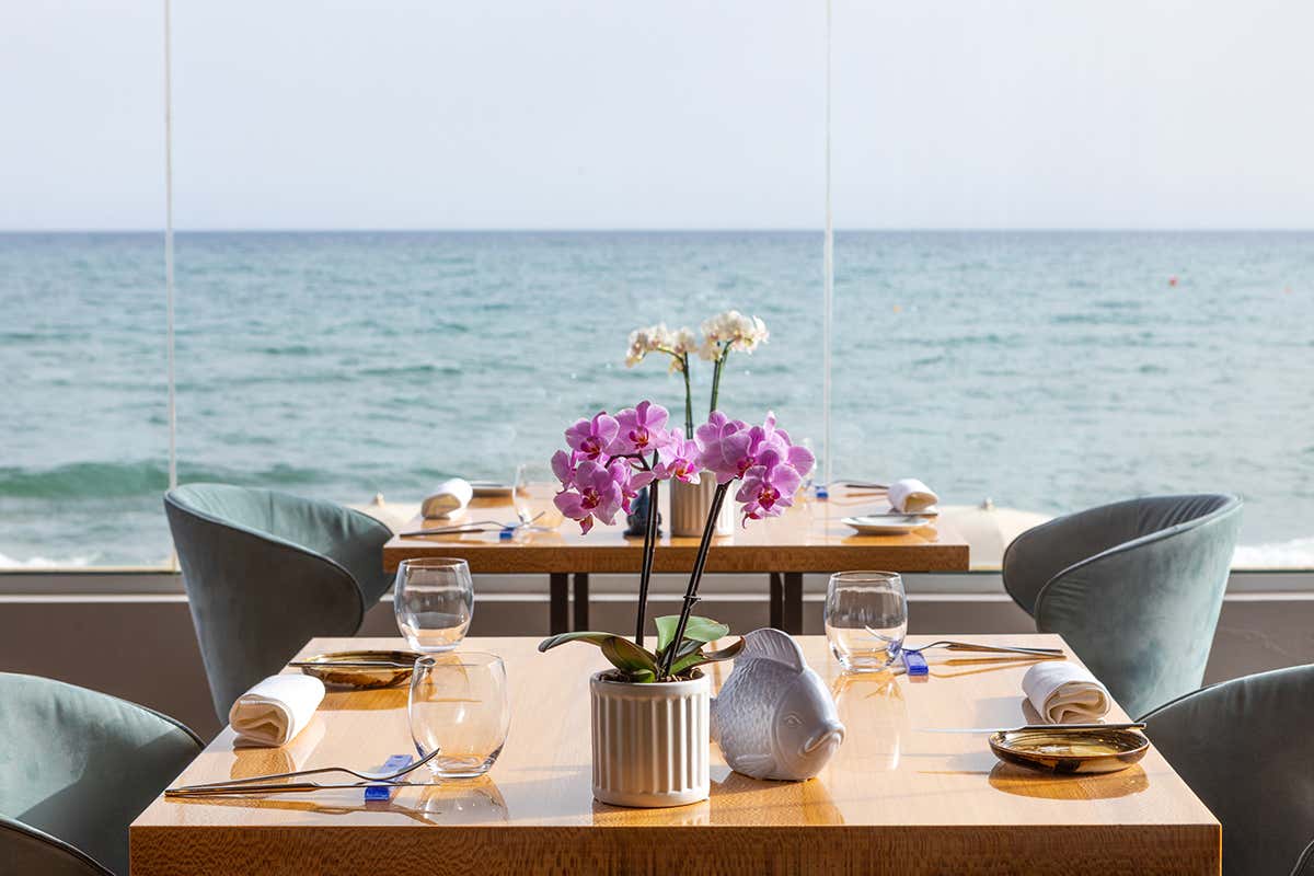 Giunti sul lungomare di Latina, tra il mare e il lago di Fogliano alle spalle, varcata la soglia de Il Fogliano Hotel New Life, ci si ritrova in una boule di cristallo, in mezzo al Mediterraneo, come se si fosse a bordo di un lussuoso yacht, con la brezza marina che accarezza il viso. La vista si perde davanti a un orizzonte che è solo mare. Le pareti in cristallo, le poltroncine color acqua marina, i tavoli artigianali in legno laccato evocano una spiaggia dorata, mentre quelli in resina grigia sono materici come le lisce rocce delle Seychelles e, infine, quelli in marmo vetrato ricordano uno specchio d’acqua in cui si riflette l’ambiente circostante. I coralli a decorazione e i delicati giochi di orchidee accolgono l’ospite in un’atmosfera fresca, confortevole ed elegante. Entrare in questo ristorante significa prepararsi a un’esperienza che è un viaggio fuori dal tempo, in un luogo dove l’azzurro del mare trasporta lontano e il quotidiano scompare.