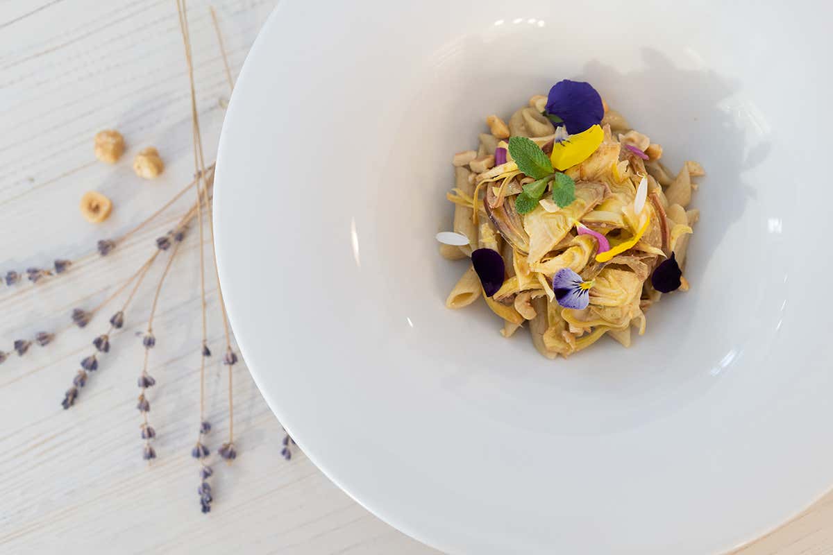 Il menu 2021 celebra i 50 anni di attività con un piatto speciale, le “Penne Graziella Ra” con crema di pane integrale, fonduta di pecorino, funghi porcini e briciole al finocchietto; la qualità di pasta impiegata nasce da un grano recuperato dalla Girolomoni e coltivato localmente intorno a Montebello. Un piatto che celebra la forte territorialità che da sempre contraddistingue l’azienda.