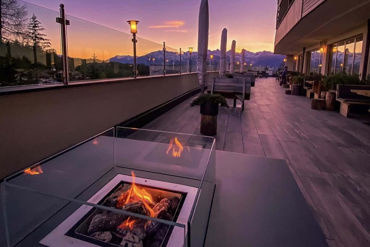 Il dehor con braciere design dello Josef Mountain Resort di Avelengo