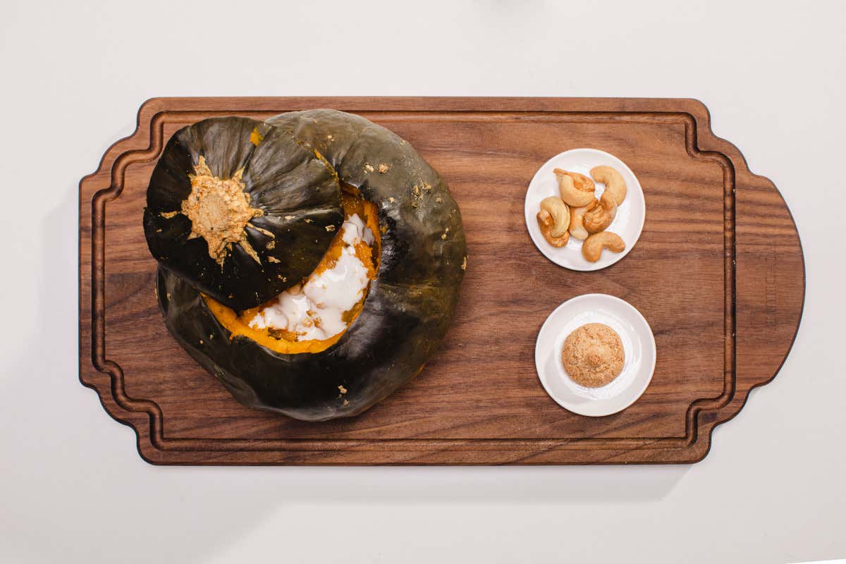 Zucca al forno, fonduta di taleggio, anacardi tostati e amaretti