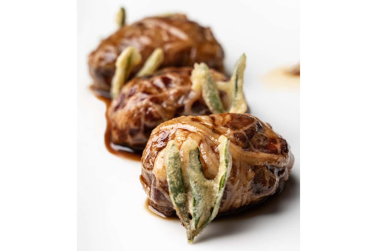 Turcinieddhi glassati alla birra con marmellata di cipolla all arancia critmi in tempura e infuso di luppolo. Foto: autfotografia