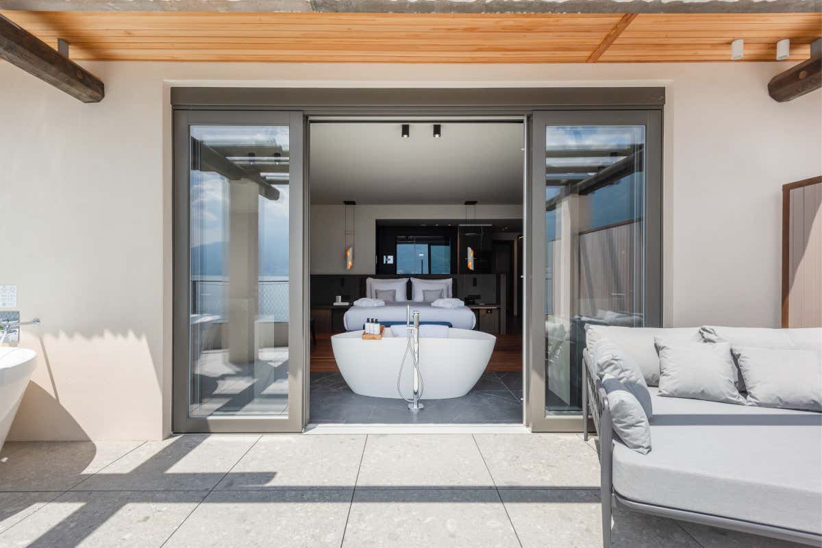 Ispirata all’acqua, questa suite di circa 85 mq è impreziosita dal color argento, Argantos appunto. Toni nature di parquet e pareti si abbinano al gres del bagno open space, mentre una lamina color argento al centro del soffitto, grazie a un particolare gioco di luci, ricrea riverberi analoghi a quelli dell’acqua e trasporta in un’altra dimensione. Letto super king size, bagno turco, Airpool e sauna panoramica sul balcone rappresentano il vero lusso di questa spa suite, disponibile in numero limitato (solo 4 stanze).
