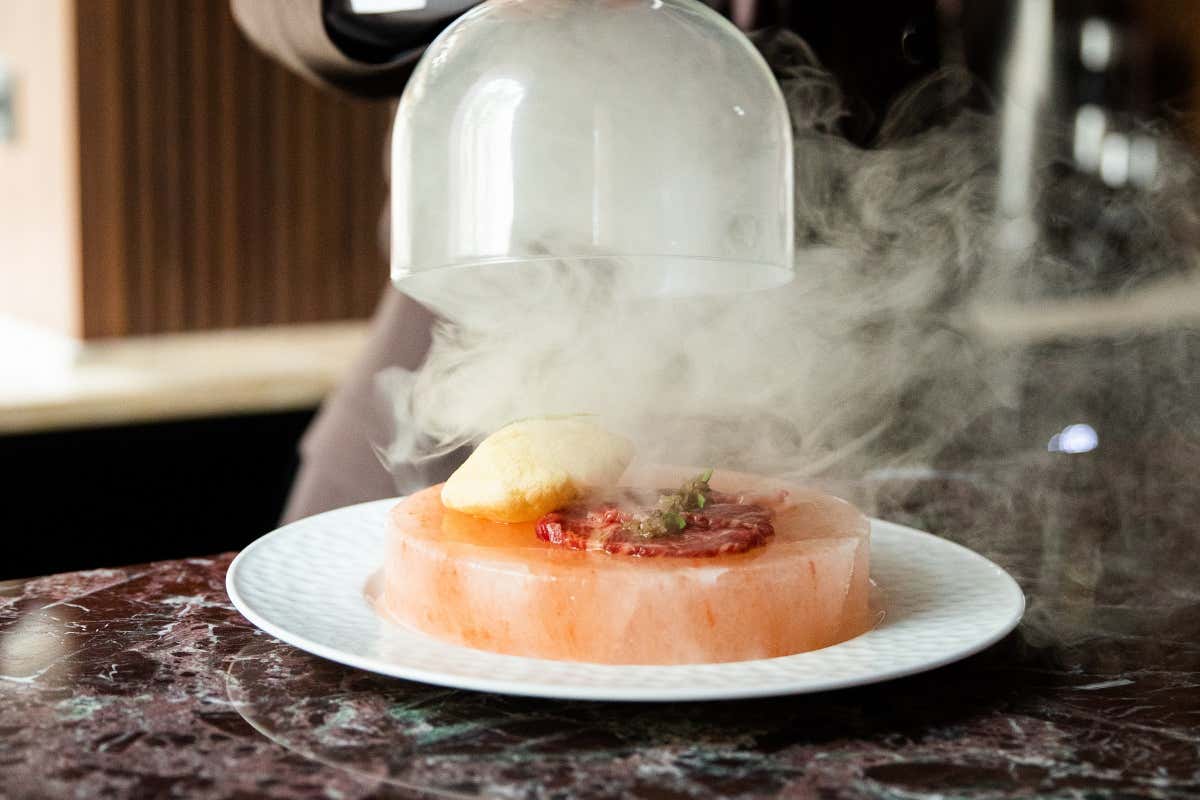 L'imprimatur stelle e strisce non faccia tuttavia pensare all'hamburger con patatine e al fish & chips. O meglio, no solo a quelli, che possono diventare gourmet. Il menu è ampio e dal gusto italiano ma sa anche sconfinare armonicamente nel buono del mondo. Imperdibili gli Spaghetti Scarpetta, esaltati dal Times, fatti in casa con pomodoro, basilico e parmigiano, superbi nella loro semplicità grazie alla materia prima e al mix perfetto tra i tre unici ingredienti. L'Italia nel piatto, quella della memoria evergreen, è rappresentata anche dai Ravioli cacio e pepe e dagli Agnolotti con midollo. Ma c'è anche la Fricassea di Funghi e Tartufo, una morbida e cremosa polentina che accompagna funghi tartufati, il Plateau di pesce crudo e crostacei. Non mancano le proposte americane di American Cut, altro brand storico delle steakhouse, ed è imperdibile una degustazione della NY Strip Steak, del Pastrami Rib-Eye, del Porterhouse e del Tomahawk, impegnativa bistecca gigante che ricorda l'arma con cui i nativi americani difendevano i propri territori. Ma c'è anche l'esotico, col Wagyu giapponese in smoke, con pane soffiato e riduzione di dragoncello presentato scenograficamente su un piedistallo di sale rosa dell’Himalaya e coperto da una boule di vetro che all'apertuta sprigiona una nuvola di fumo. Infine, una nota dolce, tra l’immancabile New York Cheesecake con salsa di frutti di bosco. Gran finale con una mega coppa di Cracker Jack Sundae, gelato di crema home made con popcorn caramellati e torrone di arachidi, indimenticabile percorso tra gusti, temperature e consistenze. Anche le referenze della carta dei vini consentono di fare il giro del mondo, ma con un'attenzione in più per quelli nazionali e per le bollicine.