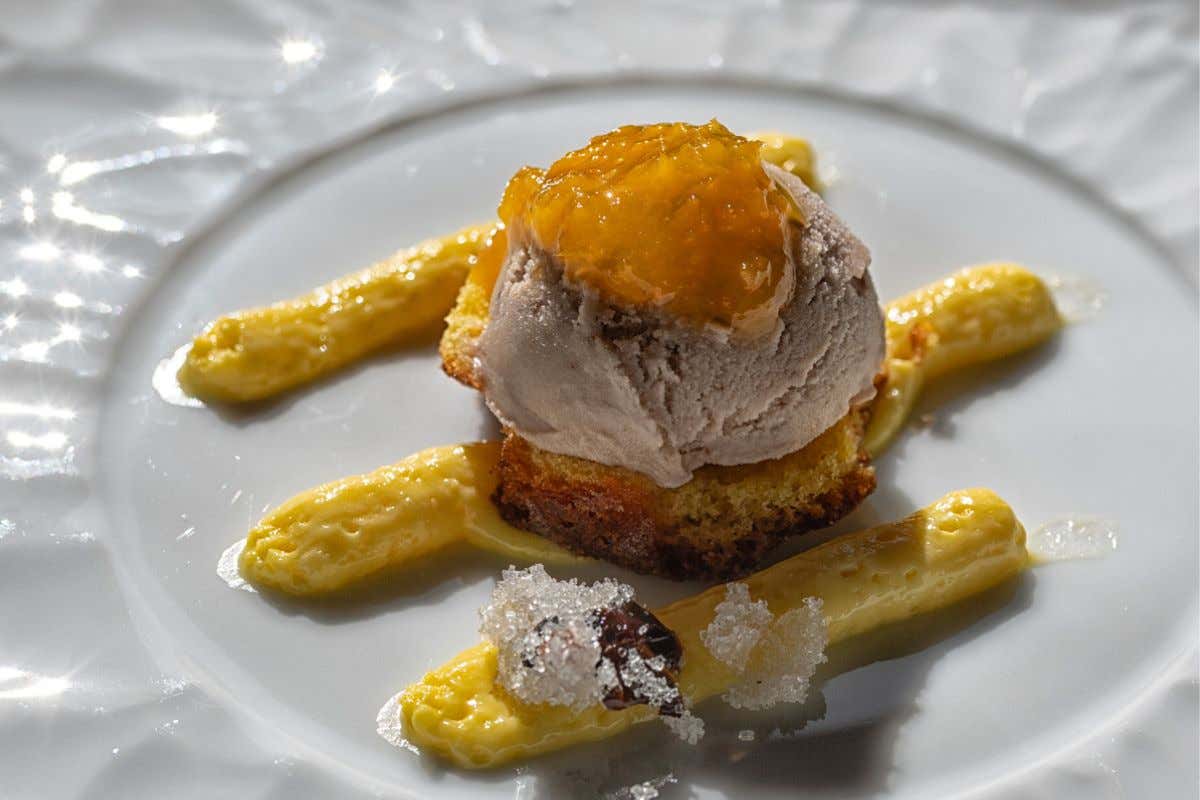 Tra i secondi non poteva mancare la faraona alla leccarda, una delle ricette regine dell’Umbria, accompagnata da spinacino selvatico e un caprino molto, molto, piacevole. Gran finale, riconosciuto da un membro del team salato come me, con il dessert. Storico, in carta da oltre 10 anni e non si fatica a capirne il motivo. Un gelato di olive (e già qui da elogiare l’originalità) di varietà taggiasca (ligure ma tra le cultivar più delicate esistenti, quindi la più adatta da rendere gelato rispetto a un'oliva umbra più amara e piccante) con mandarino su un soffice biscotto. Chapeaux.