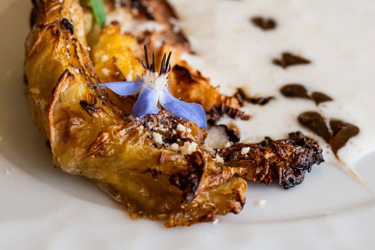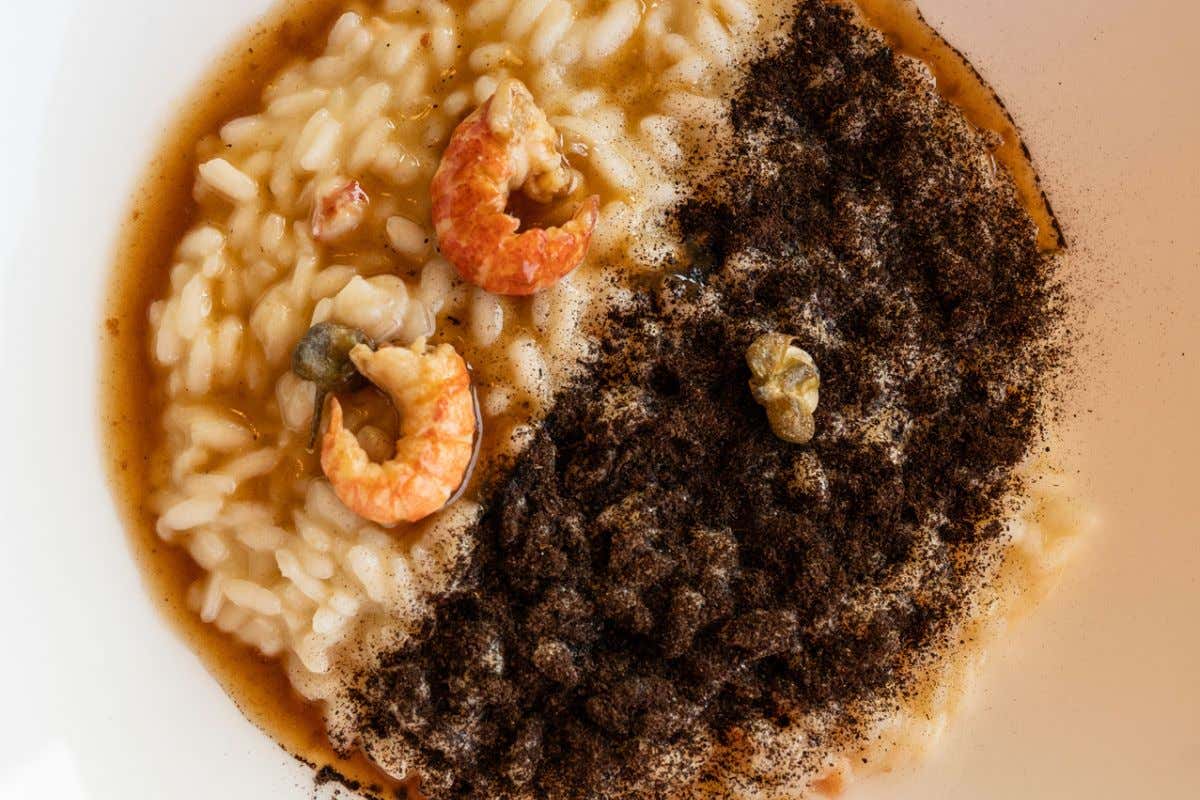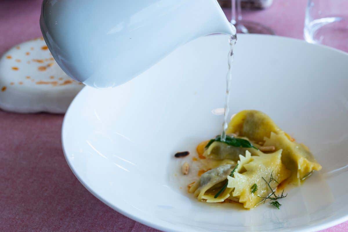 Una verza, non proprio qualcosa che adoro di base, arrostita con fondo di patate e latte di mandorle. Il vegetale, laddove più di spessore, assumeva quasi una consistenza carnosa. E quel sentore di abbrustolito, combinato anche con la dolcezza del latte di mandorle, wow. Tra i primi mi ha convinto di più un piacevolmente grezzo raviolo ripieno di cinghiale con brodo di pigna, (di base brodo di pollo, con pigna infusa nel finale per pochi minuti per conferire un gradevole sentore di resina) godibilissimo anche se fosse stato da solo, rispetto al risotto con gamberi di fiume, porro e capperi. Il riso lo preferisco più “tenace”, il porro non è proprio un ortaggio che adoro, dall’amaro troppo spiccato. Ma è pura questione di gusti personali.