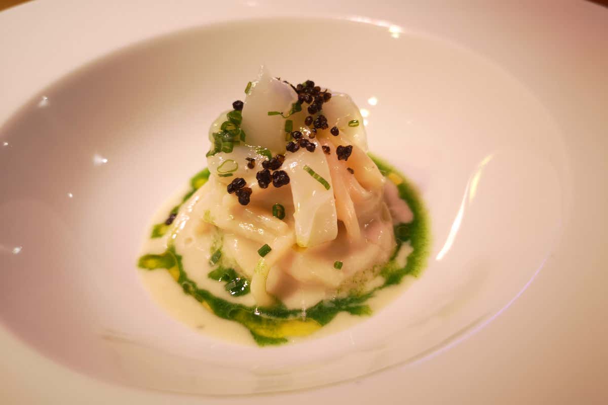 Superlativo il Fagiolo di mare, una combinazione magistrale di polpo, seppia, gamberone e cozze alla brace accompagnate da una morbida vellutata di cannellini, il tutto arricchito da foglie al nero, erbe aromatiche e un tocco sottile di aria di balsamico. In questo piatto, la profonda conoscenza di Mocellin si manifesta appieno: un'opera che, apparentemente semplice e di facile comprensione, nasconde deliberatamente tutte le complessità reali, dalla fase progettuale a quella esecutiva. Una maestria che si estende anche a portate che, giocoforza, hanno un ruolo di comparsa anziché di protagonista. Ad esempio, l'Insalata, che va oltre l'ordinaria misticanza e assume un ruolo funzionale, per pulire il palato e preparare l'approccio al piatto successivo. In questo caso, la progettualità è evidente: il contenitore è stato abbattuto a meno 40° per garantire la temperatura ideale. Il piatto si distingue per l'uso sapiente di tecniche, consistenze e lavorazioni: insalata, mela in osmosi di limone, erba cipollina, basilico rosso, aneto, pomodoro condito con balsamico, sorbetto al pomodoro e basilico dolce.