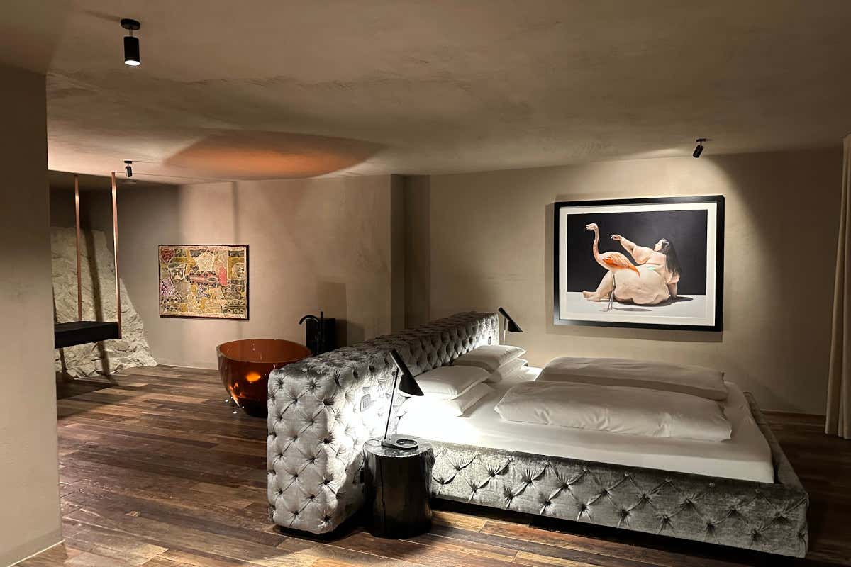 Ogni camera è un gioiello di stile, diversa dalle altre, che mixa pavimenti in parquet (dal legno vivo delle vecchie baite di montagna) alla luccicante quarzite argentea e mette in contrasto mobili antichi come gli armadi dipinti tirolesi, coi letti dalle altissime testiere in pelle o che rivisitano il baldacchino; tappeti fluo e lavabi in pietra naturale e vasche idromassaggio a vista. L’ispirato interior designer è il patron del Turm, il vulcanico Stefan Pramstrahler che con la moglie Kathi - spa manager e sommelier - ridefinisce il concetto di ospitalità e ogni anno aggiunge un tassello prezioso alla vacanza perfetta.
