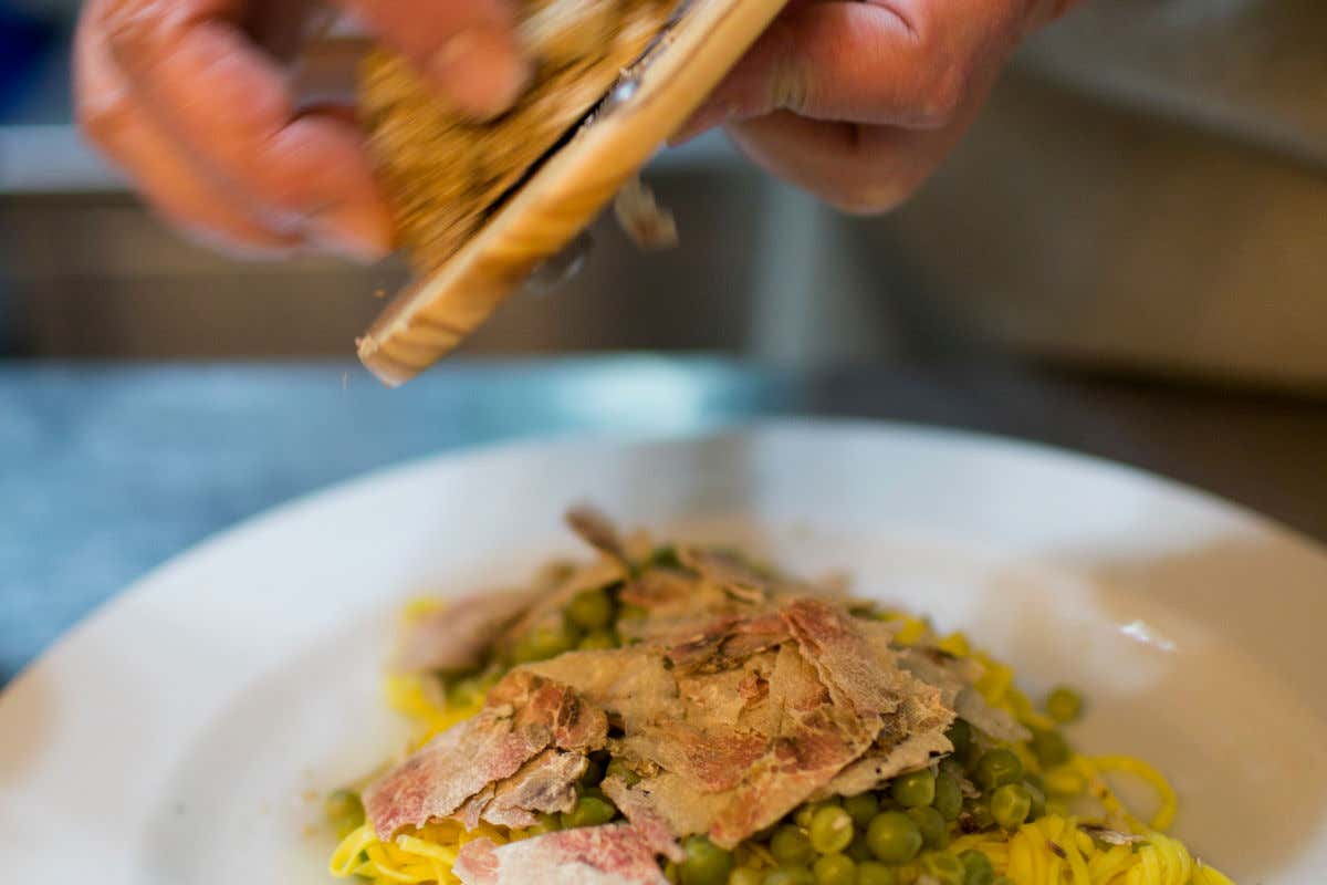 Amo coccolare i clienti e capire se hanno bisogno della mia “minestrina” che non è nel menu perché voglio così. Con le stelline brodo e pomarola e parmigiano, ricordo dell’infanzia di tutti noi…. Ma per Pasqua ho creato i tortellini con il ripieno di carne di pecora cotti nel brodo di pecora, una delizia che ci riporta alla tradizione della zona di Campi Bisenzio. La settimana scorsa ho trovato all’interno di una gallinella le sue uova ed ho fatto la bottarga io da accompagnare ad un uovo fritto! Insomma, mi adeguo al prodotto e lo valorizzo.
