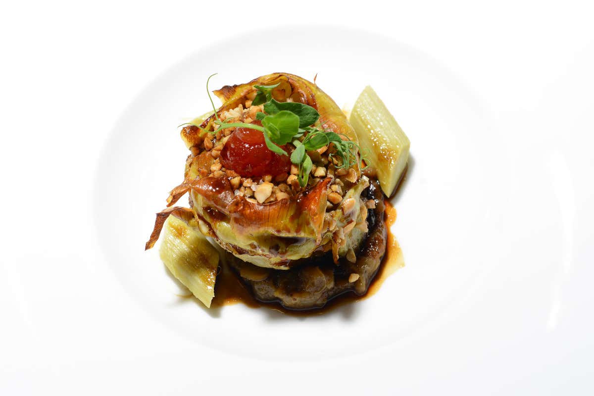 Carciofo arrosto, purea di melanzane, arachidi, confettura di pomodoro e vaniglia