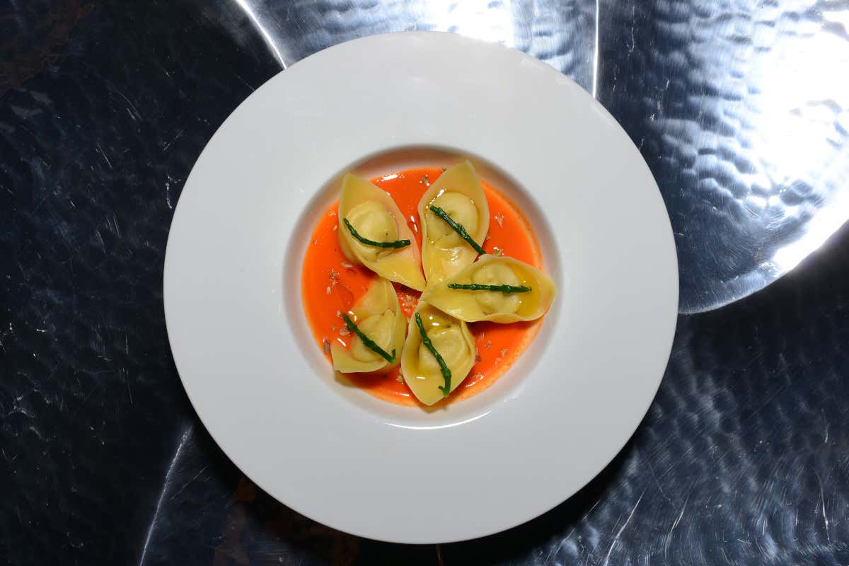 Tortello di anguilla in salsa alla pizzaiola e salicornia