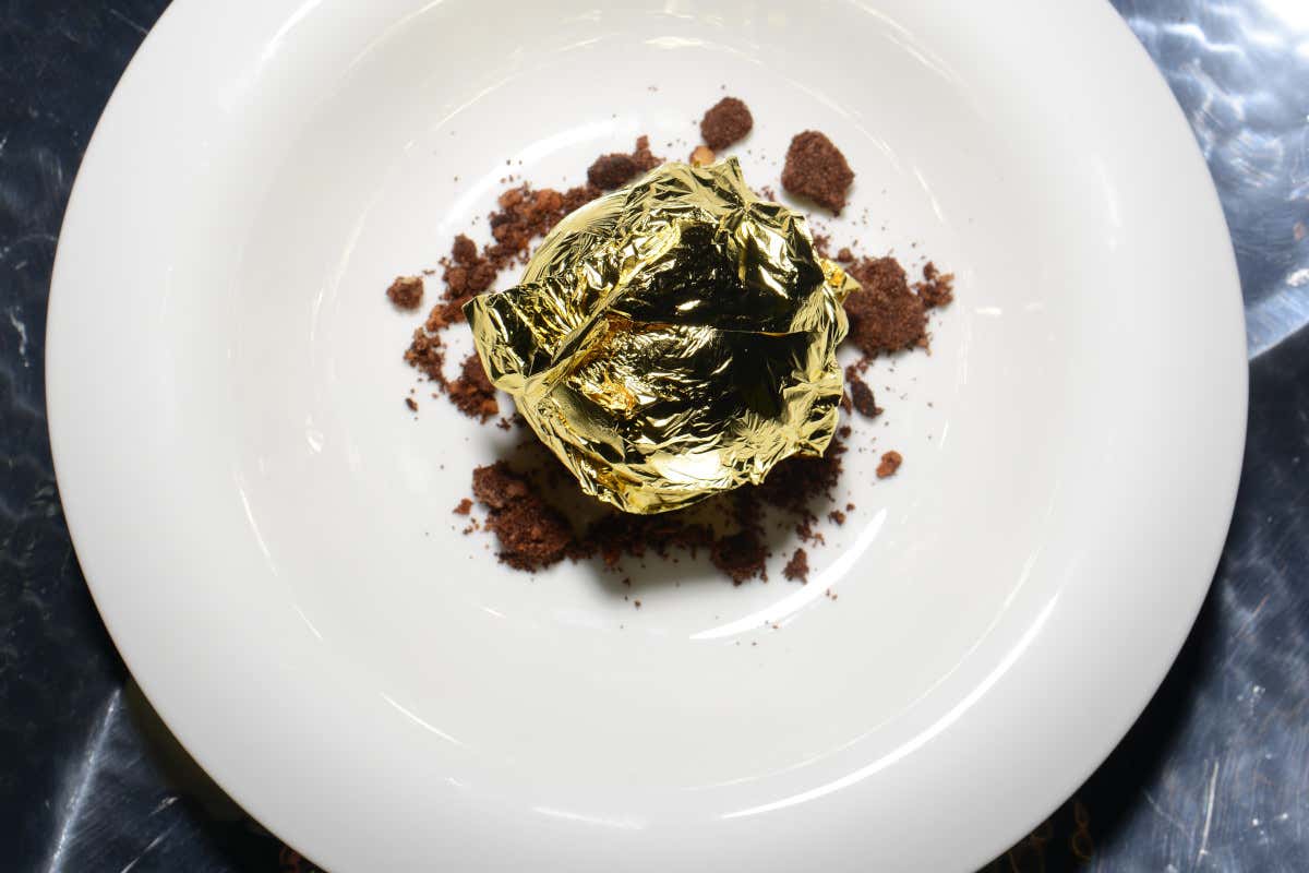 Complimenti al pastry chef Halit Gajda che ha messo in tavola dei ghiotti grissini e una golosa “Sfera di cioccolato oro e cremoso al caffè”. La presentazione era di grande effetto: una foglia d’oro sopra la sfera, poi il cucchiaino è affondato nel cioccolato fondente per arrivare al cuore con una mousse deliziosa, soprattutto non stucchevole.