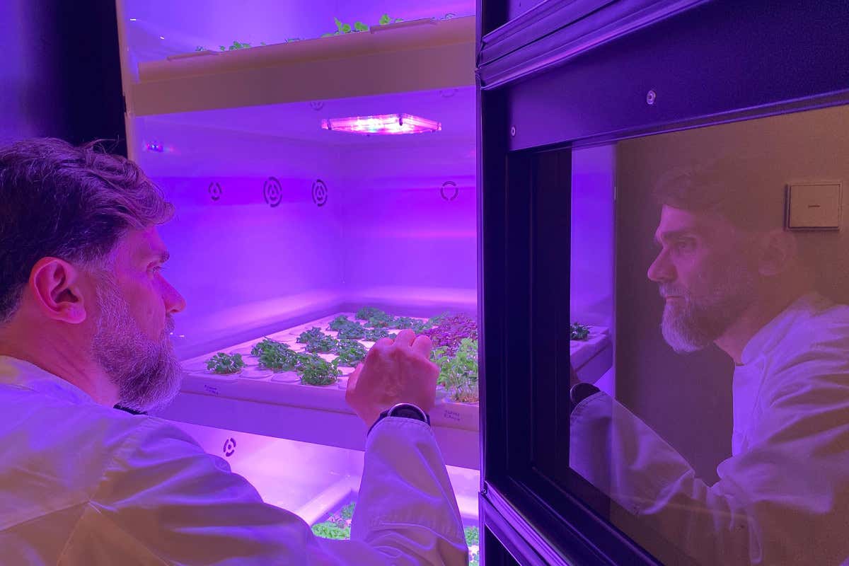 Lo chef Filippo Sinisgalli nel suo orto verticale al Ristorante Zur Kaiserkron di Bolzano