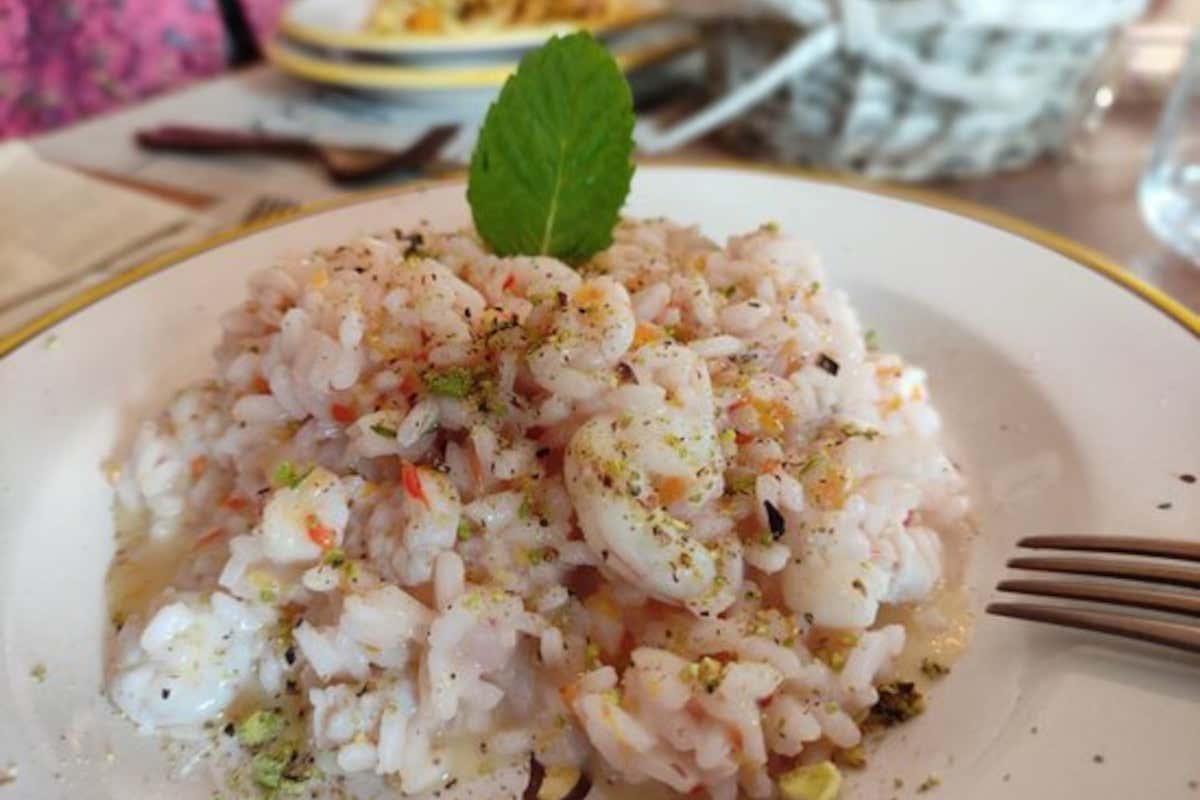 Il dovizioso antipasto, ghiotto caleidoscopio degli odori etnei, da solo varrebbe la cena. Imperdibili tra i primi a base di pesce, le casarecce fresche con tonno e pistacchio; a seguire, dai suoi profumi preceduto mentre il piatto giunge in tavola, il delicato risotto agli agrumi e gamberetti. A proposito di piatti, fuori di sineddoche, i piatti sono belli a vedersi, manufatti da abili artigiani siciliani. Con il secondo si vira sulle carni, in funzione di ciò anche il vino trasmuta il suo colore dal delicato rosato all'austero quanto vibrante rosso. Eccoci allo squisito filetto in crosta di nocciole. Rientro sontuoso del Pistacchio Verde di Bronte Dop nel delicato tortino caldo al pistacchio con gelato di cannella.