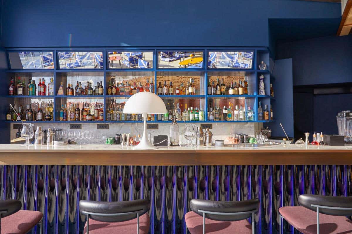 Il bancone bar, realizzato con materiali preziosi e riflettenti, rivestito con elementi sagomati di cotto smaltato blu, marmo e microspecchi, è il vero protagonista della scena, così disegnato per creare una precisa inquadratura cinematografica visibile da ogni punto del locale. La pavimentazione materica in cemento, unica fra interno ed esterno, fa risaltare i tavoli in cotto smaltato colorato a contrasto con i tessuti a grafiche e colori sulle note del blu e della cipria ispirate alle collezioni dello stilista italiano degli anni ’60 Livio De Simone.