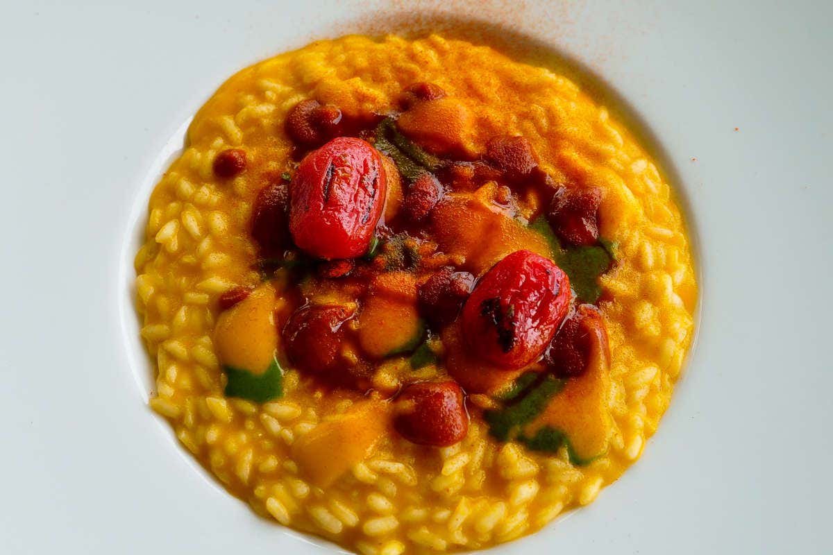 Tra i primi, si distingue il risotto Carnaroli ai sette pomodori, un vero omaggio al pomodoro in tutte le sue sfumature: dal San Marzano al datterino alla brace, ogni varietà porta un sapore deciso al piatto, rendendolo una celebrazione dell'estate emiliana. L'uso saporito del cipollotto nello spaghettone, cipollotto, estrazione di zuppa di pesce, seppia e scampi, illustra ancora una volta la capacità del ristorante di trasformare ingredienti umili in piatti di spessore.