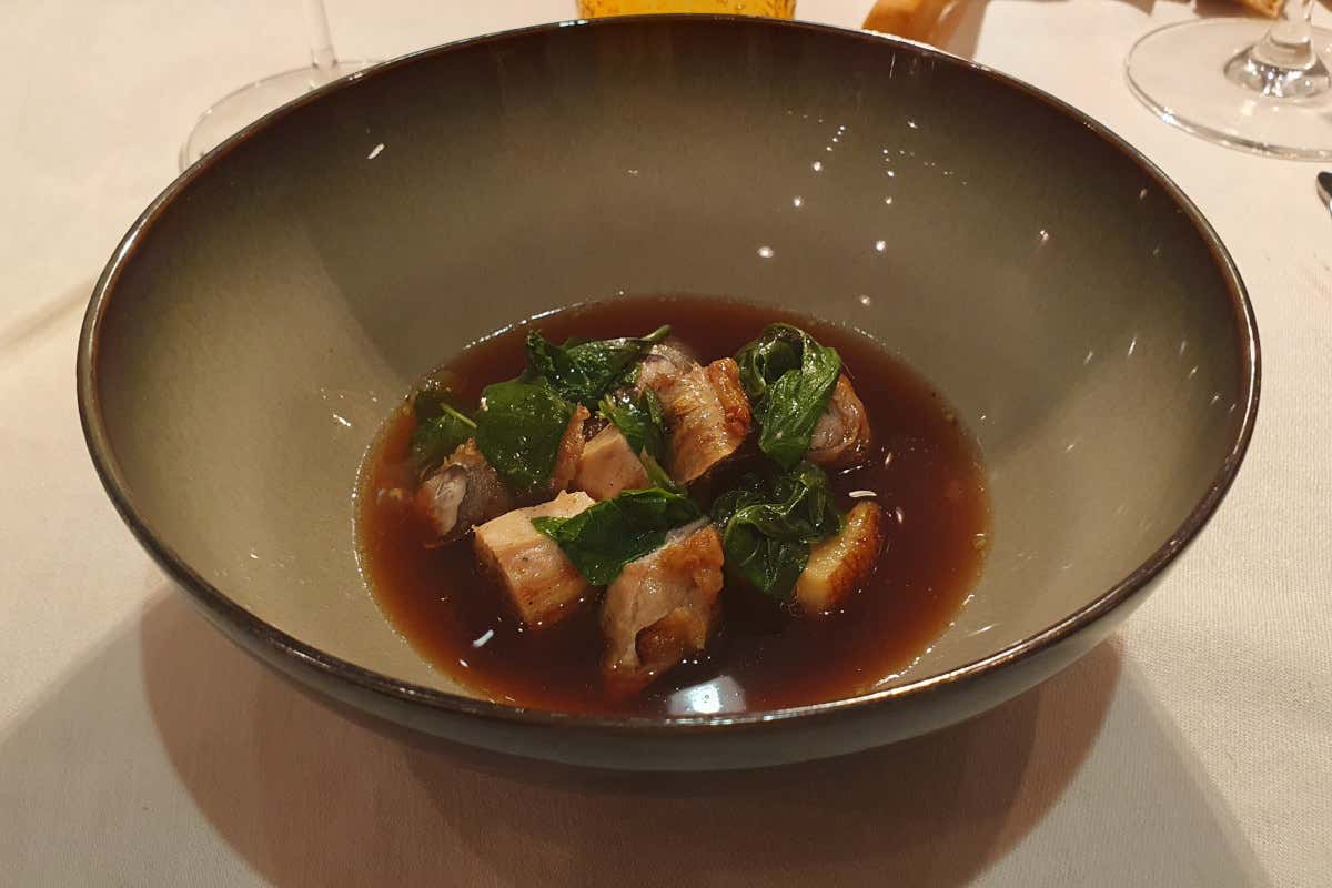 Tra gli altri piatti "cult" di Andrea Costantini non possiamo non segnalare il luccio alla gardesana, assaggiato durante la mia recente visita. Una bontà la versione con il cappero fritto impreziosita con cipolla agrodolce, pesto di prezzemolo e acciuga, brodo montato all’olio di cipolla e aglio. Un piatto intrigante e peccaminoso al pari del "Pot au feu di Gallina Grisa della Lessinia e sarda di lago alla brace" (una libidine la sarda alla brace avvolta nel guanciale con basilico e menta) con il tocco magico del brodo di fragola, alga, Madera e spezie varie versato al tavolo. Piatto da stanging ovation abbinato allo Spumante Brut Talento Metodo Classico Diamicton (da uve Chardonnay, Pinot Nero e Pinot Meunier) annata 2016 del winemaker trentino Vito Piffer.