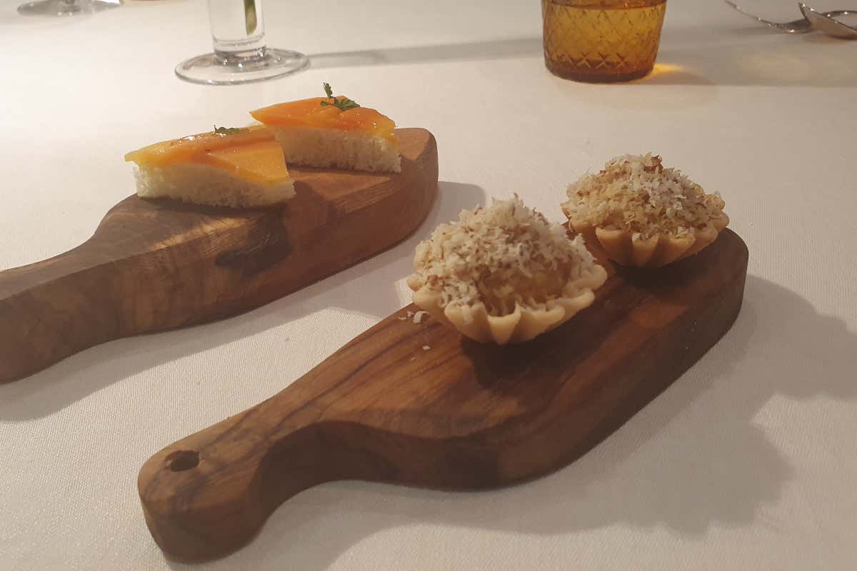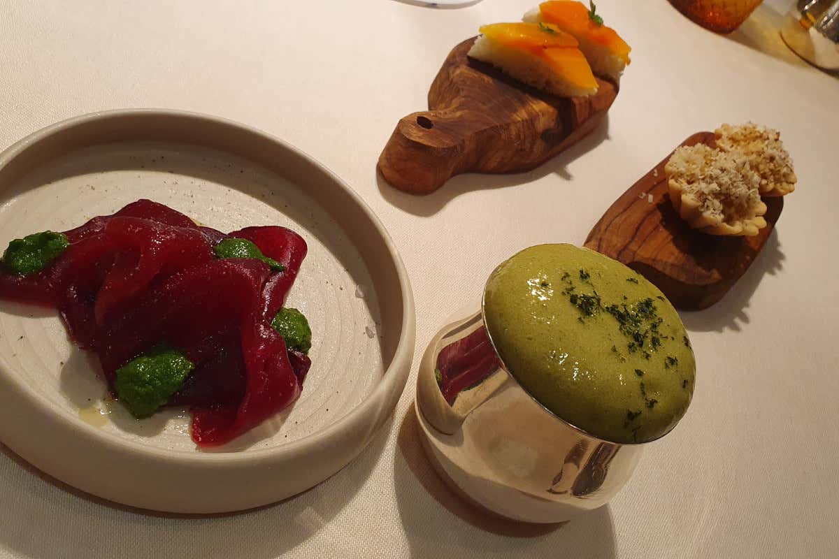 Dimenticavo - imperdonabile, chiedo venia allo chef - gli "amuse bouche" di benvenuto: la tartelletta con purea di rapa gialla al Grand Marnier, arancia e polvere di menta; la Canapè al salmone vegano; la Bresaola di rapa rossa e pesto di rucola; la Spuma green di spinaci, cetrioli, menta, datteri, mela e banana; i Cubetti di mela verde al gin sul fondo del bicchierino. Un trionfo di colori, profumi e sapori. Chapeau!