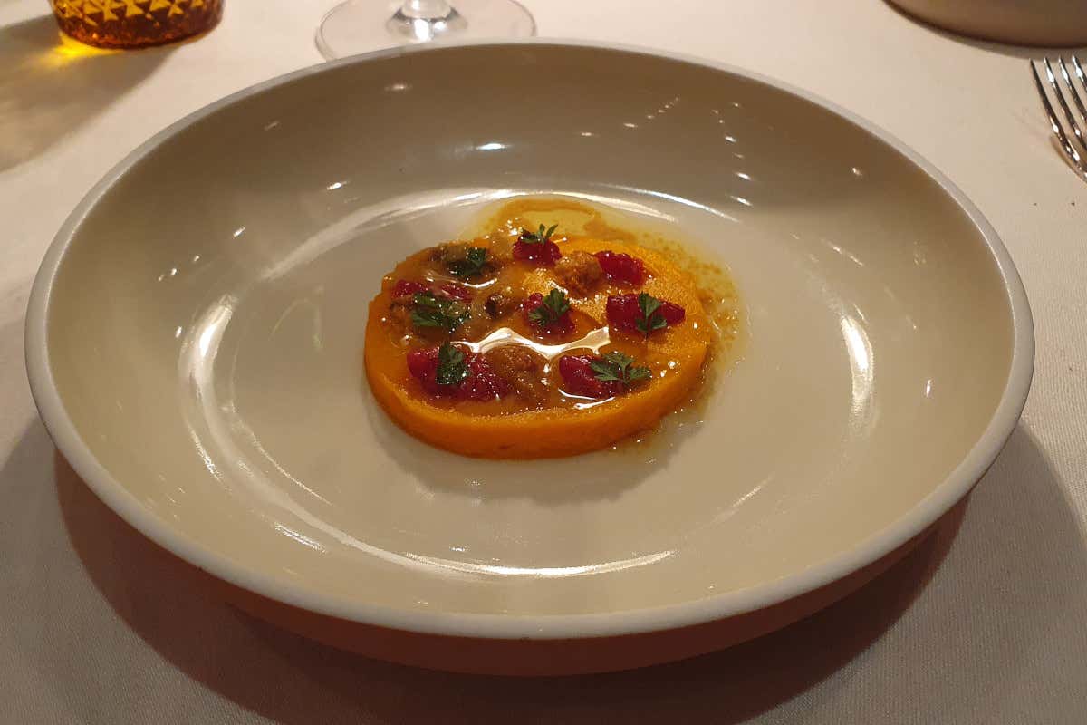 Anche l’elemento vegetale è uno dei protagonisti dei suoi piatti. "Non lardo", "Spaghetti cacio e pepe di mandorla", "Melanzana Steak", "Cavolfiore e nocciola, burro di ricci di mare e albicocca", "Risina mantecato cacio e pepe con ragù di trippette di baccalà". Piatto delizioso, quest'ultimo (l'ho assaggiato nel corso di una mia recente visita) in cui il famoso fagiolino di Spello (risina) viene ammorbidito in ammollo, risottato, mantecato con cacio e pepe e impreziosito con ragù di trippa di baccalà in rosso e menta al burro. Un piatto che, accompagnato dallo Champagne Blanc de blanc Grand Cru "La Reserve" di Bonnet Gilmert, da solo valeva il viaggio.