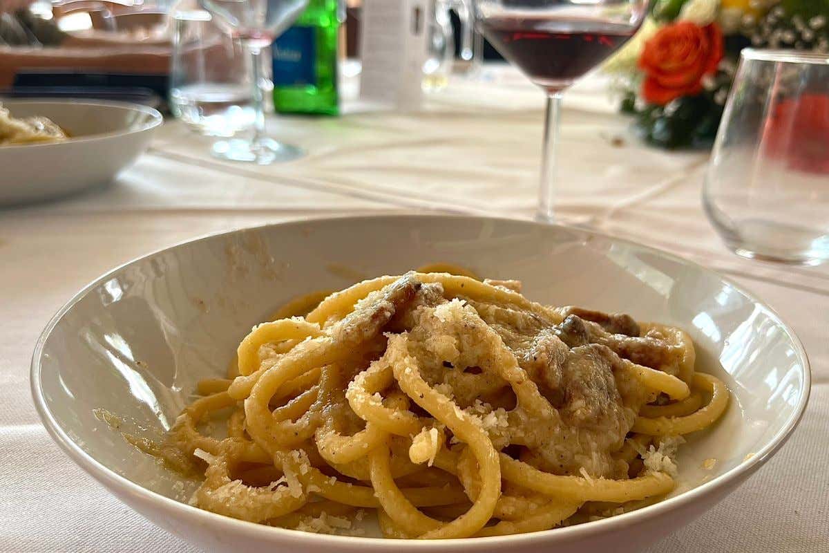 Conclusione inevitabile una degustazione di salumi e di piatti della romanità in cui i prodotti aziendali hanno fatto la differenza. Ed ecco i crostoni, i Rigatoni all'amatriciana e gli Spaghettoni alla gricia con il guanciale di Cinta Senese, il roast beef di Maremmana, gli Involtini di Chianina, lo Spezzatino di Marchiana con cicoria, le Polpette di bollito e la Coda alla vaccinara. Vini in abbinamento della Cantina Castello di Torre in Pietra, azienda vinicola interamente biologica, presentati dalla sommelier Catia Minghi: Spumante Brut metodo Charmat, il Fiano in purezza Macchia Sacra 2021 e il rosso Roma Rosso Riserva DOC 2019 (Montepulciano, Sangiovese e Syrah).