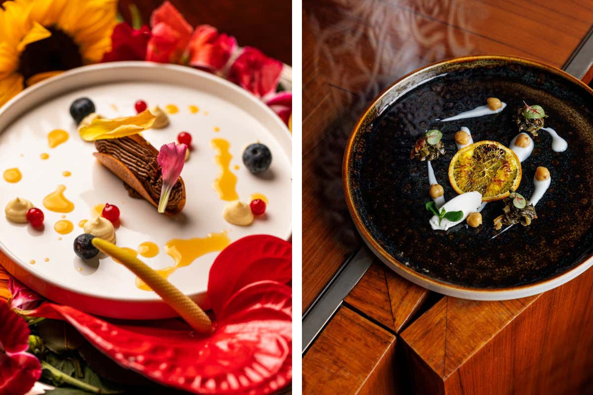 Tacos con mousse di cioccolato crema di albicocca gelato alla crema e Zimino di bietole, agrume spadellato, robiola, ceci