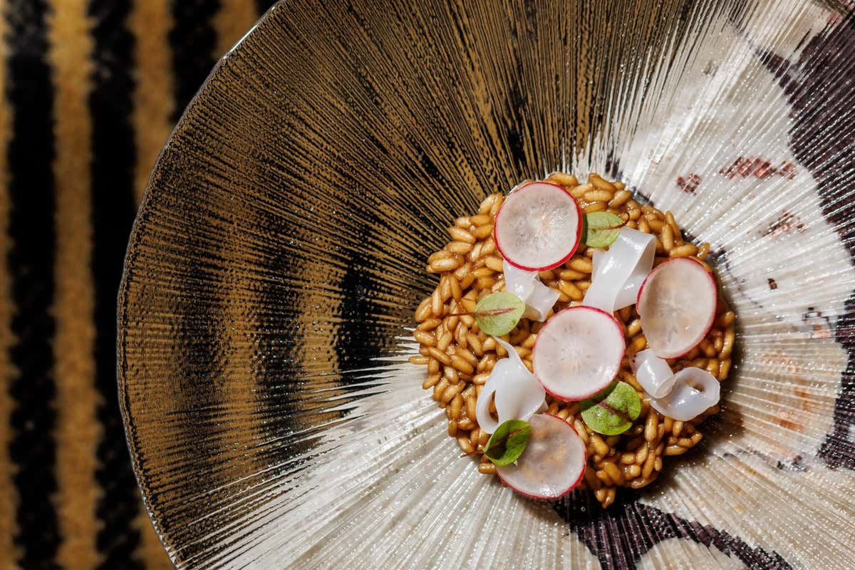 Risotto al brodo di legno amaro, petali di seppia e ravanelli