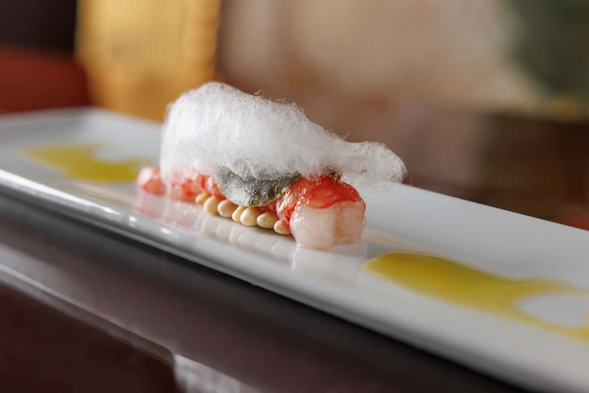 Gambero con zucchero filato, salsa di senape, miele, tartufo e olio al basilico