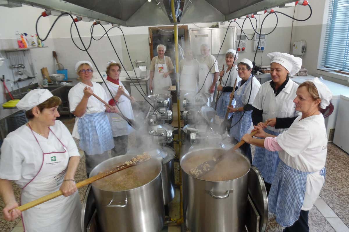 I volontari al lavoro per preparare i Fasulìn de l'öc cun le cudeghe