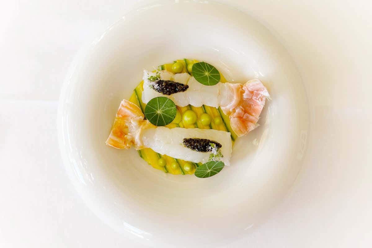 Ci sono quattro antipasti imprescindibili e incredibili per l’equilibrio nei contrasti fra i vari elementi gustativi. La Variazione di Verdure di stagione, con erbette spontanee, germogli, piselli, con vapore aromatizzato, fiori ed essenze. «Adesso si avvicina il momento di funghi zucca e ravanelli». La Ricciola marinata con mandarino e carote. L’Astice patate, carote e pompelmo. Lo Scampo scottato zucchine alla scapece mozzarella liquida e caviale.