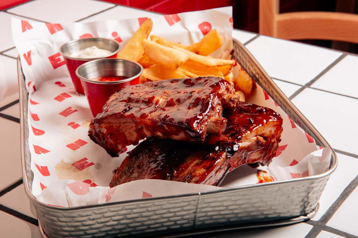 Costine laccate alla cacciatora: Ribs di maiale servite con patatine fritte, ketchup ai peperoni e maionese alla romana di Anvedi