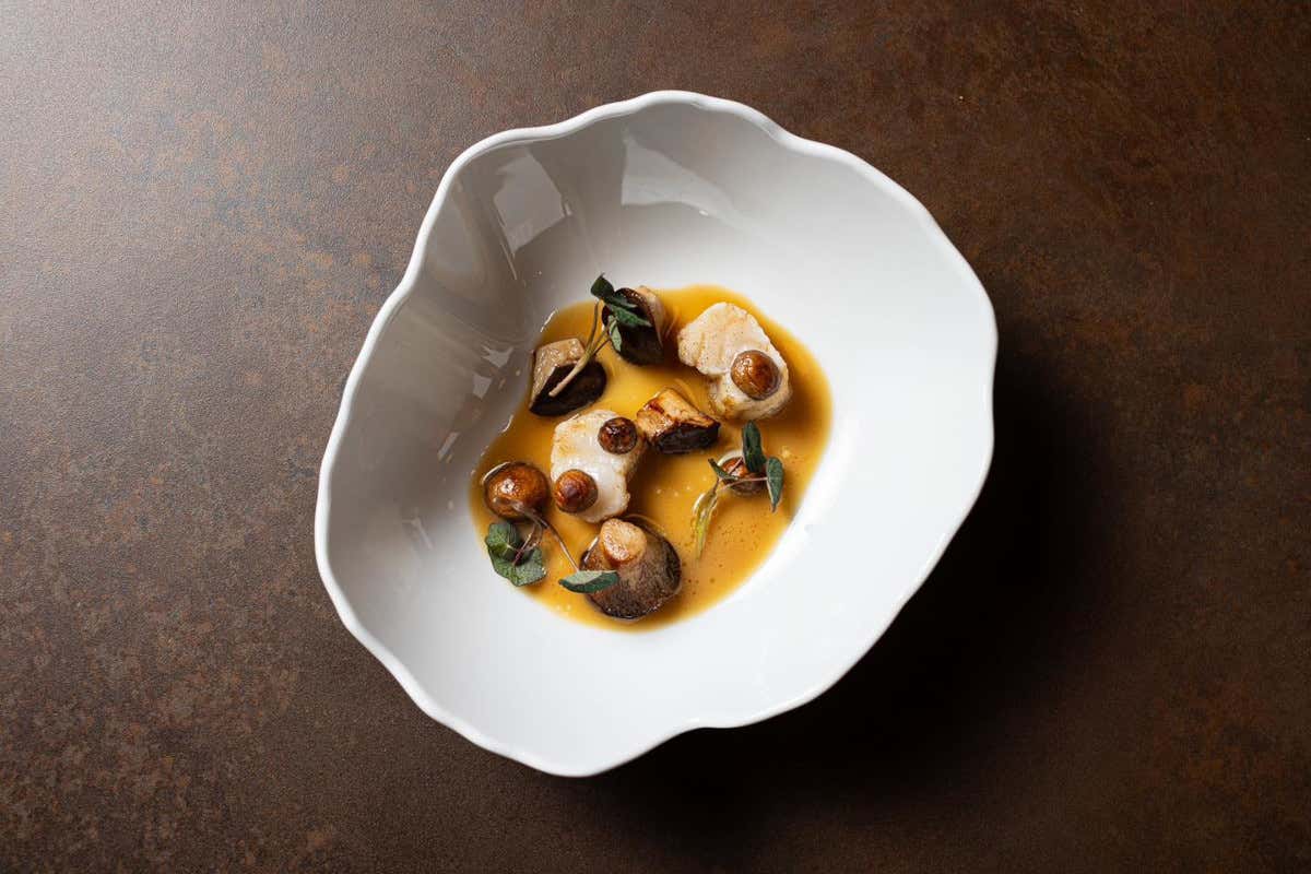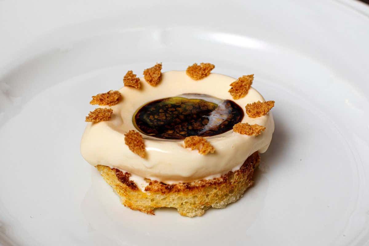 Piccolo memorabile capolavoro il primo piatto: Riso all'assassina, limone nero, siracha. La siracha, (o sriracha) è una salsa di origine thailandese a base di peperoncini piccanti, aglio, zucchero, sale e aceto bianco. Ha gusto agrodolce che dà sprint a pietanze a base di pesce (destinazione d’uso iniziale) ma anche a uova, zuppe e hamburger. Dimostrazione di grande guizzo creativo, da parte degli chef, l’utilizzo in questo squisito piatto. Per secondo, anch’esso ragguardevole: Ombrina, cavolfiore, mandorle. Per dolce: Limone, pino, meringa. Nel calice, fino al dolce escluso, ci ha tenuto egregiamente compagnia il Montepulciano d’Abruzzo Colline Teramane Docg 2020 fatto da Emidio Pepe.