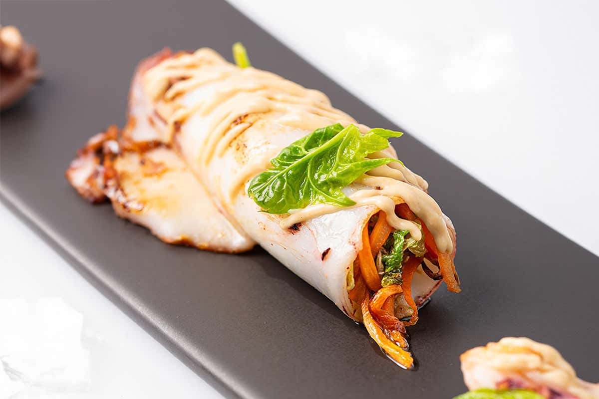 La squisita terrina di melanzana è guarnita con tzatziki di mandorla e noce moscata. La salsa tzatziki è a base di yogurt greco e cetrioli. Il calamaro è con verdure sauté, gamberi bianchi, arachidi e senape. Memorabile, semplicemente squisito, Cavatelli e Seppia, con bottarga di muggine, zucchine e fiorilli. La meringata chiude dolcemente sì squisito pranzo.