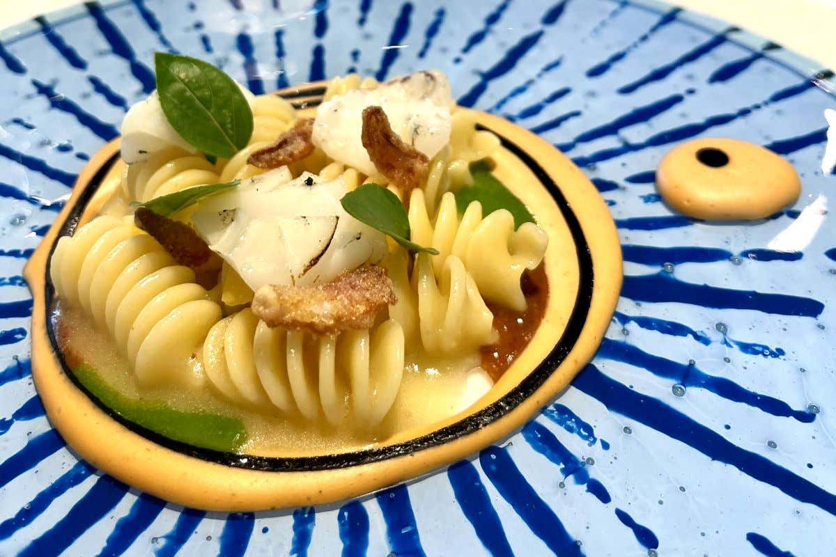Fusillone con crema di mandorle, ricci di mare, seppie e prezzemolo di Le Cattedrali Relais