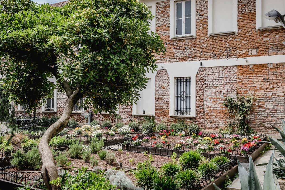 All'esterno, si estende un giardino con un orto, adornato da undici glicini secolari, due magnifiche magnolie, alberi di tiglio, rose, camelie, siepi di gelsomino, ginepri, gerani, margherite, camomille e bocche di leone. Tra le piante, si trovano anche diverse spezie come basilico, menta, lavanda, alloro e salvia. Attraverso un piccolo vialetto si accede al ristorante dove si viene accolti nel locale bar con un bancone importante e dove si può scegliere di prendere un aperitivo o anche decidere di mangiare qualcosa al bancone.
