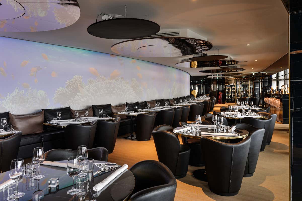 Alla terrazza si affianca un'ampia sala interna che si distingue per un design contemporaneo, con arredi eleganti caratterizzati da tonalità scure che contribuiscono a creare un ambiente sofisticato e ricercato. Un elemento distintivo della sala è lo schermo che occupa l'intera parete, su cui è possibile trasmettere proiezioni selezionate e personalizzate, nel caso di eventi privati, coniugando l’esperienza culinaria a un’esperienza visiva immersiva.