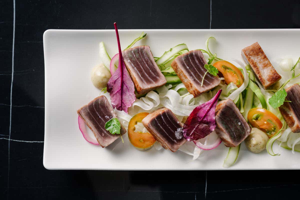 Il sole è sceso, ci si è goduti l'aperitivo con tramonto sulla città e si ha voglia di proseguire? Nessun problema. Al The Roof è possibile anche cenare. La proposta è variegata, con un'attenzione particolare ai crudi di mare, ma senza dimenticare i classici italiani, considerata anche la clientela internazionale. Ecco, allora, il Risotto alla milanese con salsa di parmigiano affumicata, salsa all’ossobuco e salsa gremolada o il Raviolo fatto a mano ripieno di bufala campana con salsa di pomodoro datterino al forno, salsa al basilico e basilico nano o ancora lo Spaghettone Monograno Felicetti all’aglio, olio, peperoncino con salsa cremosa ai ricci della Galizia, caviale di storione Baikal e uva di mare. E tra i secondi, Tonno rosso di Sicilia scottato con salsa della sua bottarga, pak choi arrostito e tonnetto katsuobushi e la Cotoletta di vitello “Orecchio d’elefante” fritta nel burro chiarificato, servita con rucola e diverse tipologie di pomodoro.