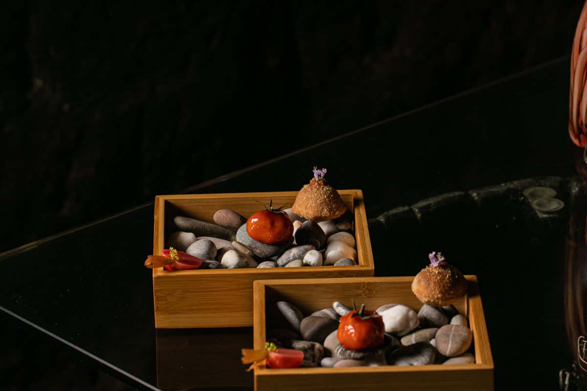 Chiusura dolce con il Sospiro di Frascati, con 4 cioccolati utilizzati come le altrettante ere geologiche visibili nella cavità naturale sottostante: una ganache di cioccolato bianco, una terra di cioccolato salato fondente, una mousse di cioccolato stagionato un mese e mezzo in grotta, una tuille al cacao e un gel di Malvasia Puntinata. Il nome del piatto riprende un modo di dire locale: il sospiro, a Frascati, è il bicchiere di vino, un momento di pausa. Ad abbinarlo il Passirò Cotarella, ancora da uve Rossetto, della famiglia dei muffati (la stessa del Sauternes).